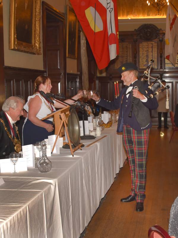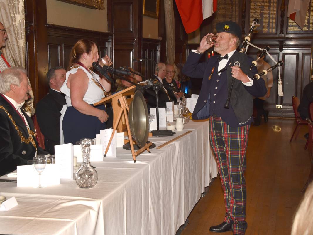 Toastmaster Adrian Pierotti advised of the entry of the Top Table, which was announced by Trumpeter, George Fleming. Auld Deacon Stewart Hamilton piped in Deacon Gillian Christiansen, Deacon Convener of the Trades House Richard Paterson OBE, Rev Mark Johnstone, Auld Deacon Jack Copeland and the other Top Table guests.
